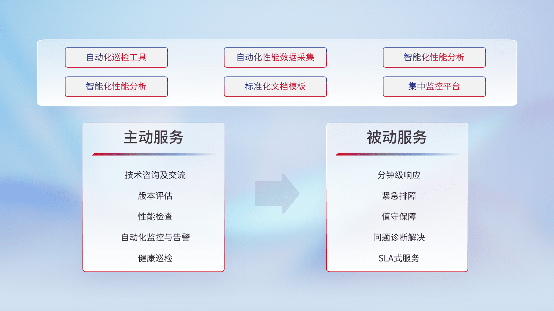 智能化工具和标准化文档,,,,保障服务质量,,,提供主动服务(包含技术咨询、、版本评估、、、、性能检查、、自动化监控与告警、、、、健康巡检)和被动服务包含(分钟级响应、、紧急排障、、值守保障、、、问题诊断解决、、SLA服务)。。。。