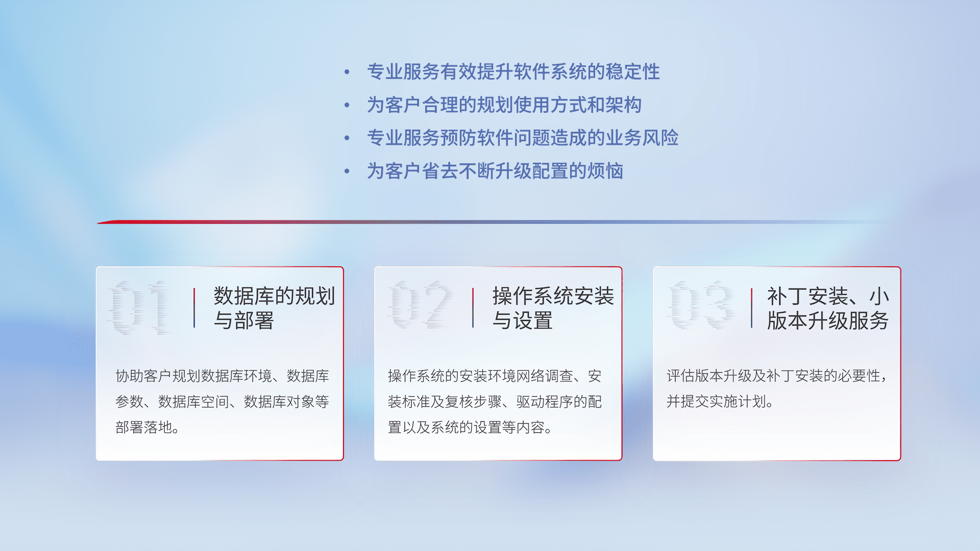 为客户提供软件规模升级、、快速部署、、按需配置的专业服务,,,,从数据库的规划与部署到操作系统的安装与设置,,再到补丁安装和小版本升级提供支持。。