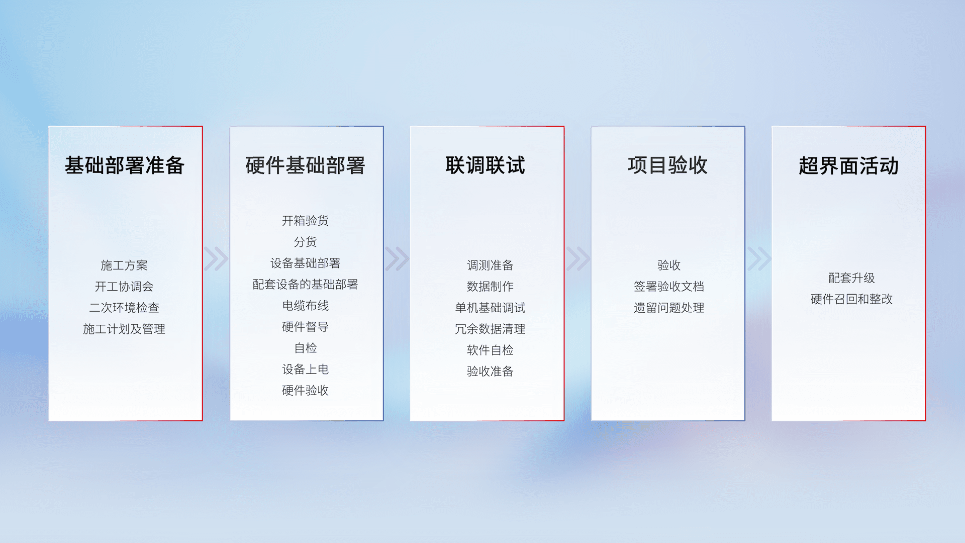 从基础部署准备、、硬件基础部署、、联调联试、、、、项目验收、、、、越界面活动的全过程可追溯,,,,保证施工质量和进度。。。。